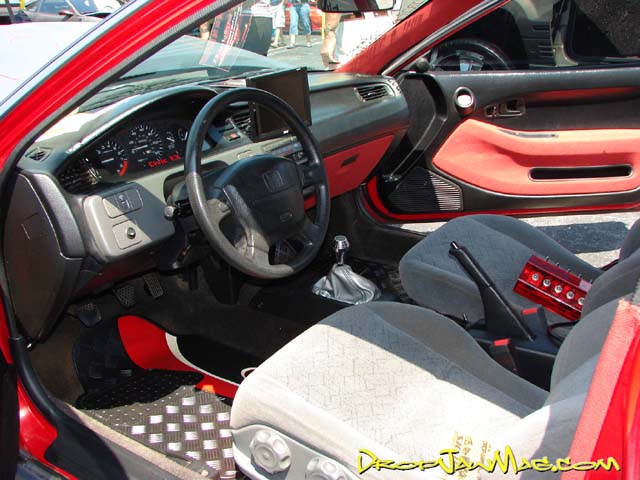 full red tweed interior, 2000 honda civic seats, red racing floor mats, power windows out of newer civic, tenzo r shifter, silver shift boot, pyle 8.4 inch tv on dash