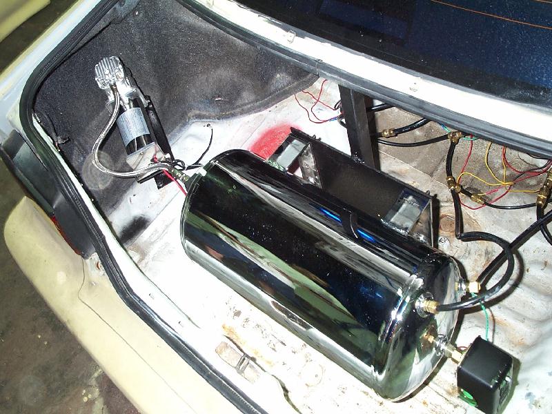 CCE AIR CYLINDER 6 GALLON CHROME TANK 10 SWITCHES IN SEE THROUGH BLUE BOX 8 gold smc valves 3/8 INCH LINE 1 chrome 380 vair COMPRESSOR 1 WATER TRAPS HAND MADE 1 OFF REAR CYLINDER BRACKETS