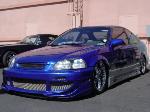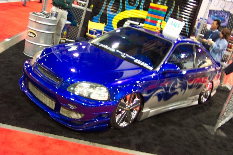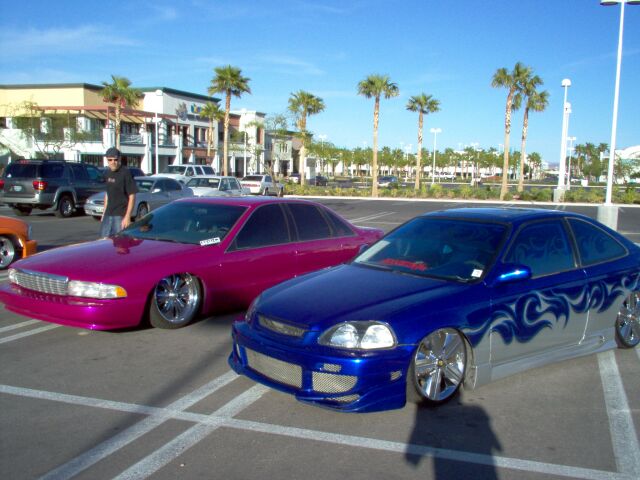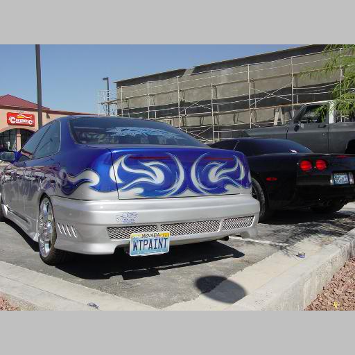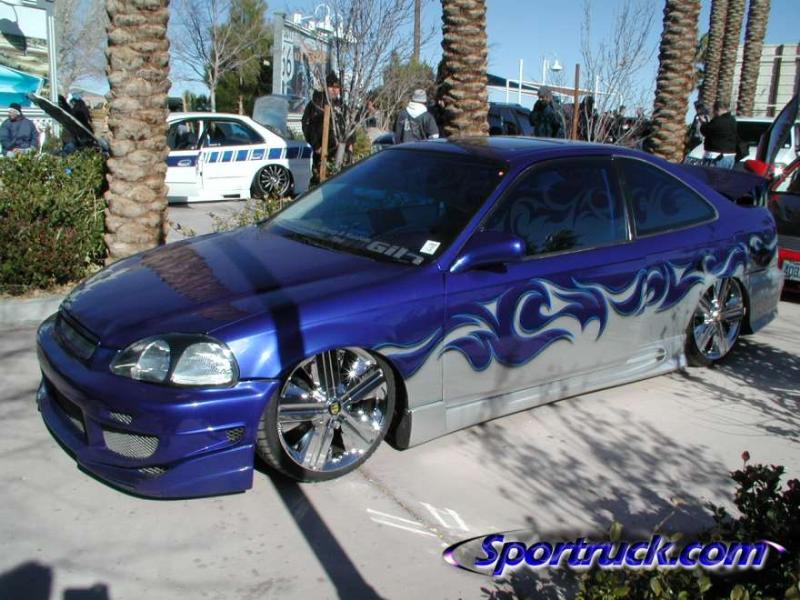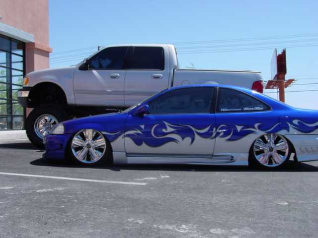 The Top half is HOK Makic Blue Pearl. and the bottom is a HOK Silver metalic something. All highlighted and shadowed through the Jams and Striped tribal style in Baby Blue. All so, shaved everything but the gas door. 2- 12" by 1/4" Hi-tech LED's for brakes. Body kit, JDM front lights. etc. All painting and Finish work Done By TENTEN CUSTOM PAINT of Las vegas