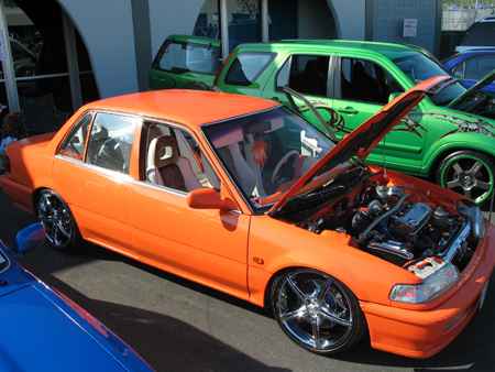JDM front clip (hood, fenders, grille, headlites, and bumper) shaved, relocated gas door by rear window next to trunk.