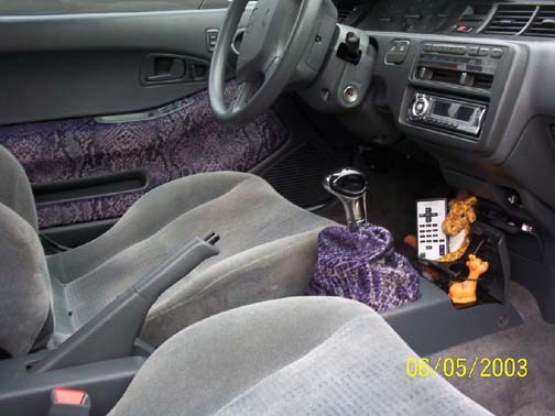 custom shift boot, visors, door pannels and seat belt pads, painted trim here and there, tinted windows, *awesome billet star mirror!!*