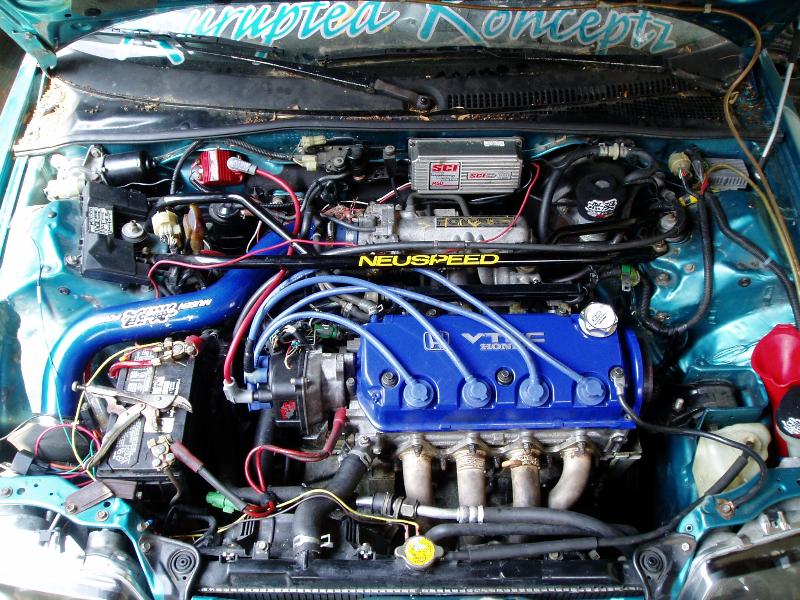 D16A6 Block, L3 Tranny, D16Z6 Vtec Head, MSD SCI w/Blaster SS Coil and Dizzy Cap(8.5mm wires on the way), OBD2 Distributor(modded by bagmazdog) Mugen CAI w/AEM Bypass Valve, DC Sports 4-2-1 Header, Resonator and 2 1/4" Custom Cat-Back Exhaust into 3 1/2" Tanabe Muffler, Neuspeed Strut Bar, P28 ECU Racing Chipped with launch control and 5,000 RPM Vtec Engagement, OBD0-OBD1 Boomslang Conversion Harness, B&M Short Throw Shifter.
