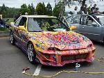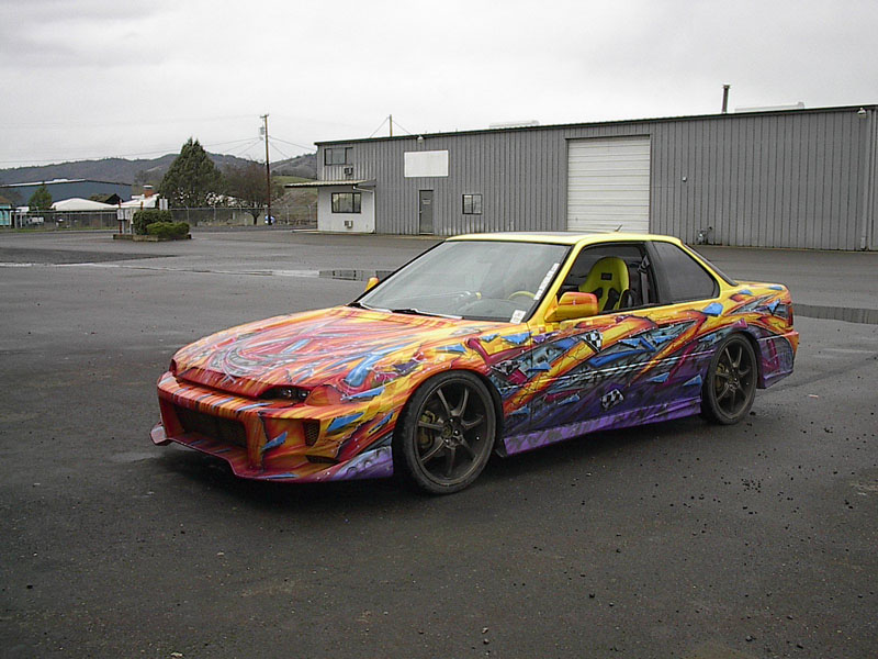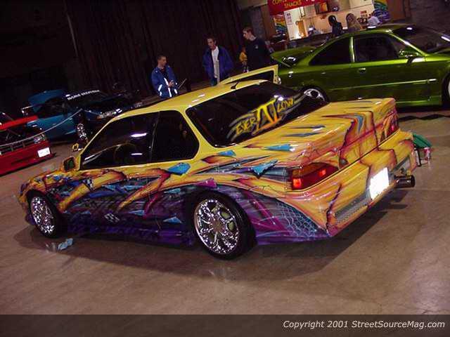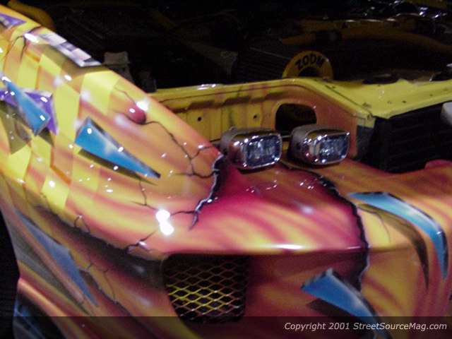 molded front bumper, shaved emblems, shaved antenna, custom hood, custom headlights, full graphics paint job