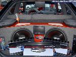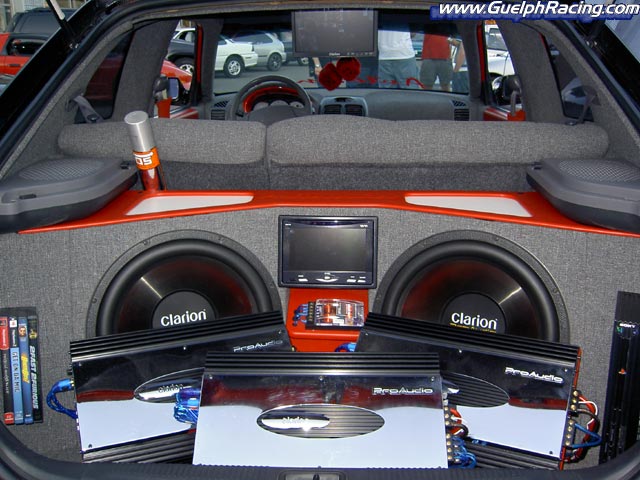 clarion touch screen deck, 2 clarion 15" clarion pro audio subs with a clarion 1000 watt amp on each a clarion 400x4 amp running the front and rear speakers, 4 clarion 7" lcd screen and 10" flip down screen with a play station 2
