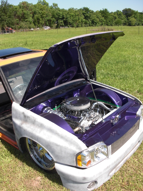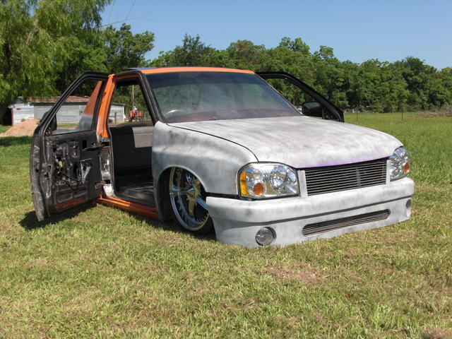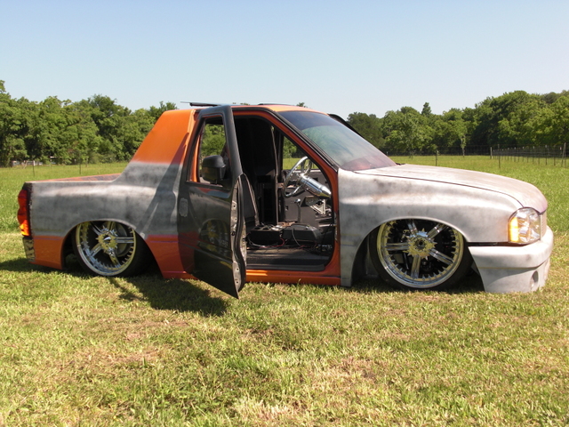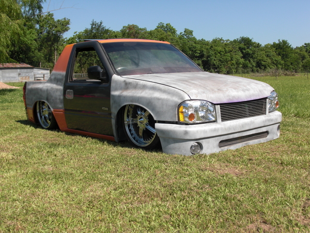 03 Frontier head lights, one off billet grill, one off bumper, raised fenders for 22s, suicide doors, full skind in back, 07 Chev tail lights (might be changing that), shaved doors, gas door, pinch welds around rear, 95 Toyota 4runner rear roll down window, smoothed bed, smoothed under side of hood, sun roof
