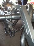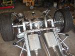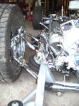 Bags with one off frame with built in air tanks(powder coated), control arms (chrome), Toyota spindles (chrome), brakes (chrome), ball joints (chrome), mustang rack (chrome), 2-link rear (chromed), Toyota rear axle, RCI fuel cell, rear train horns (chromed), 2 Thomas 337 compressors, GC 450 valves, pollished air lines and fuel lines