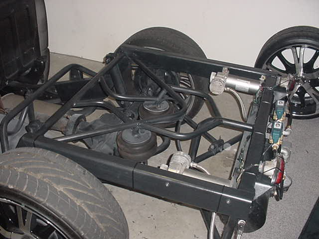 3.5" Traditional body drop 2500 and 2600 Slambags, Strong A arms upper and lower, custom backhalf frame from c notch back, adjustable 4 link, 1/2 GC Extreme 250 valves, all 1/2 line, and fittings, 2 Viair 480 compressors,line and wiring ran through frame