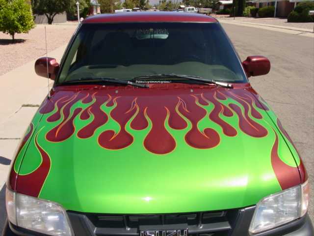 Shaved tail gate handle, shaved factory roll pan, billet l-plate frame, painted mirrors, billet ant., painted cowl,euro tail lights,2000 Hombre front clip, Flames in H.O.K. lime time pearl, Striping done by Jim Gear, Painted by Photo Finish, Billet grill