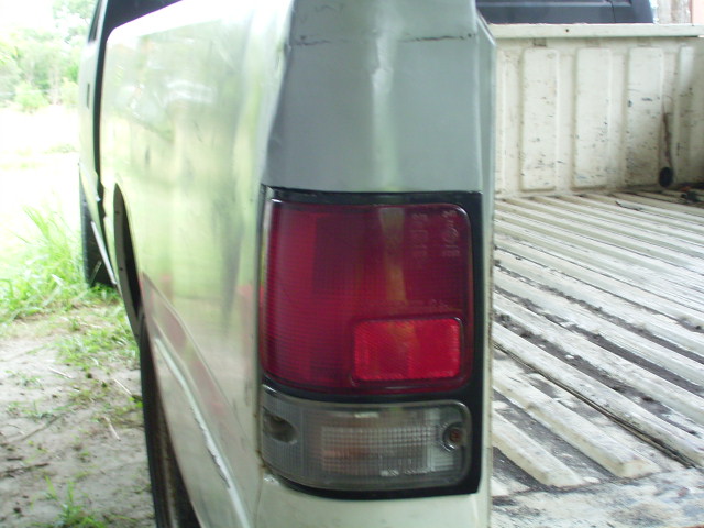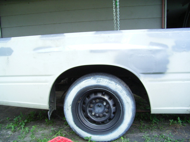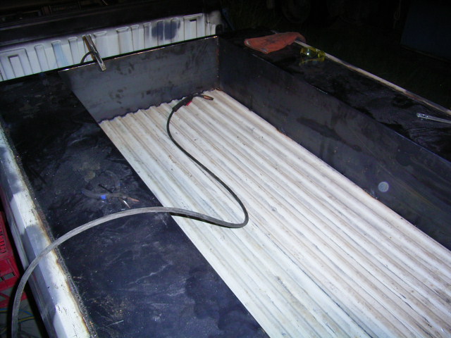 shaved bed, inc. fuel door, tie downs and the top of the tail lights, will have custom bed floor, and a combo skin, with nuber plate in the center, cab is now in primer ready for paint