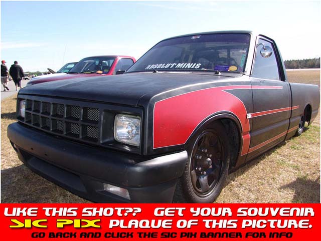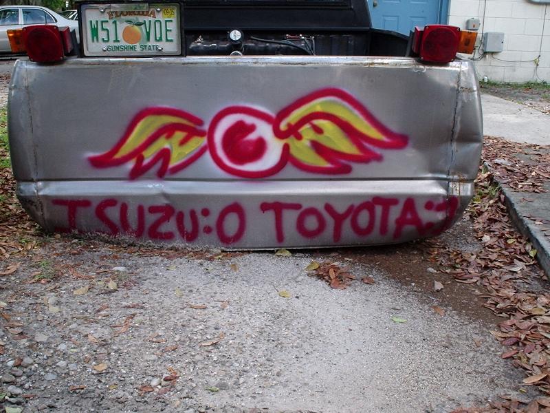 headlight conversion, mesh grill insert, '90 Isuzu bumper smoothed and welded into a 1-piece w/ valance, custom side markers, shaved: door handles, gas door, antenna hole, ol' skool side mirror mounted to door frame, can-do smooth skin with air actuated pop up tag, trailer taillights, frenched toyota front bumper right in the middle of the rear skin