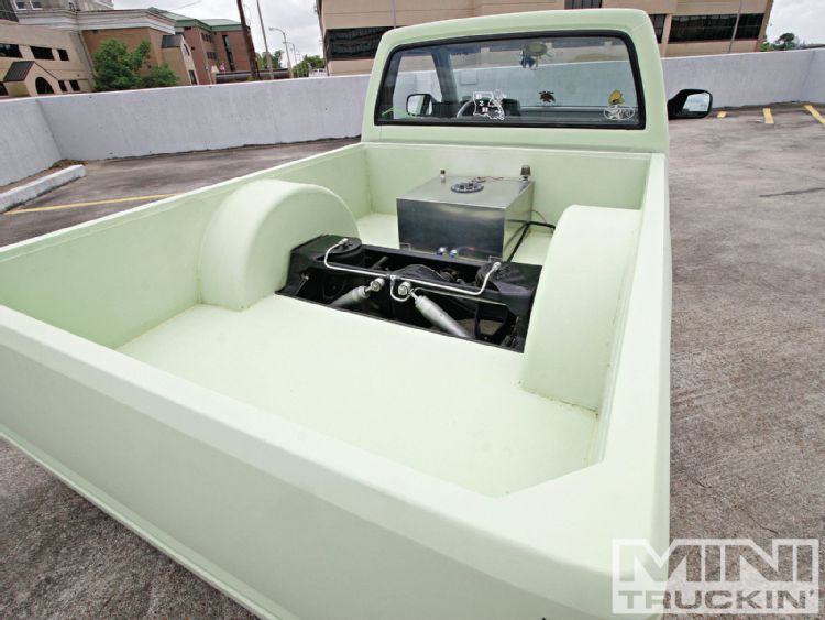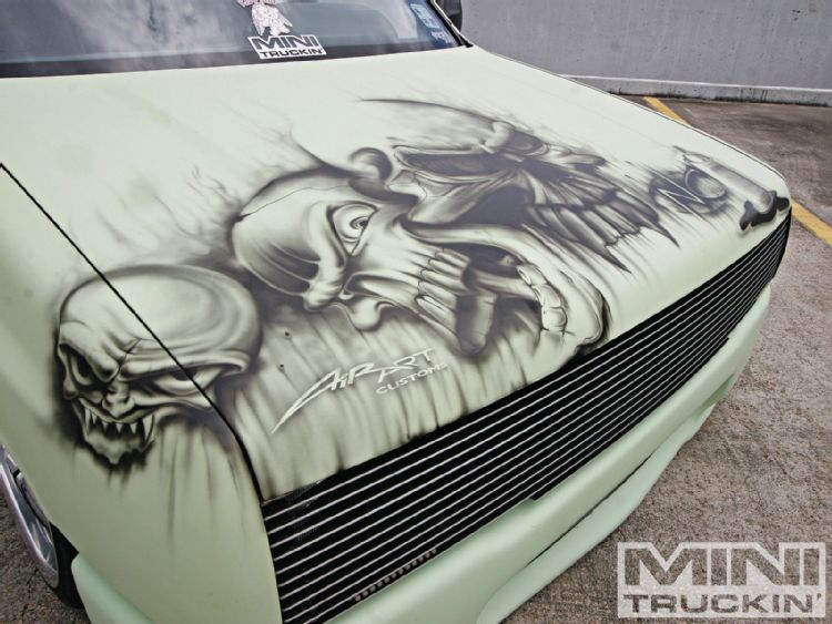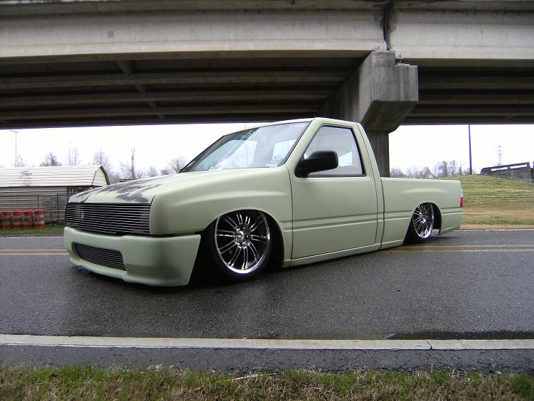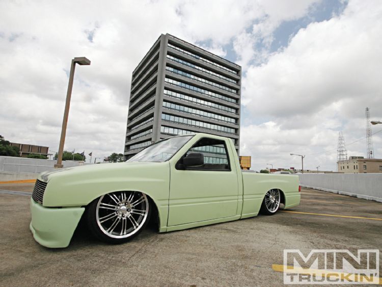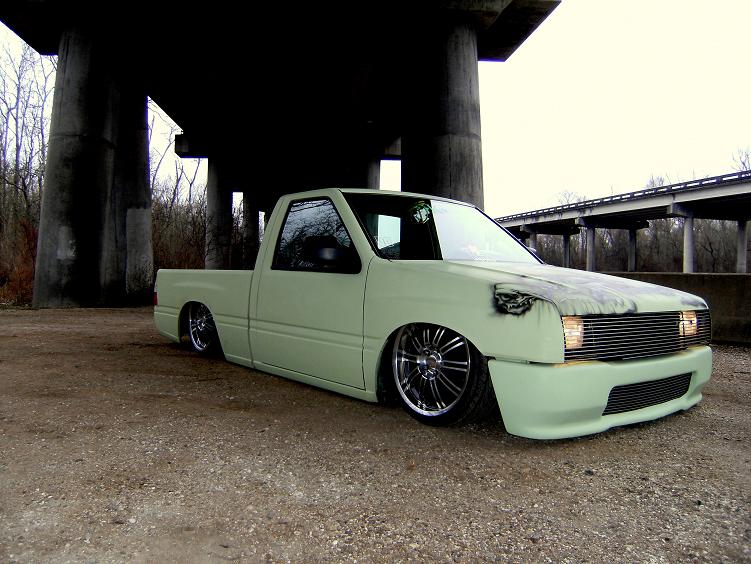 HOK Mint Green,shaved handles,mirrors,gas door,hood pissers,emblems,corners,bed seams.Rodeo door panels,Aussie Tails,Grant combo & license box,Sectioned/Smoothed & molded 4x4 Yota bumper/valence,Sheetmetal bed floor & wheels tubs,RCI 15 Gal. Fuelcell