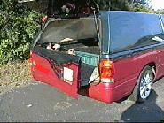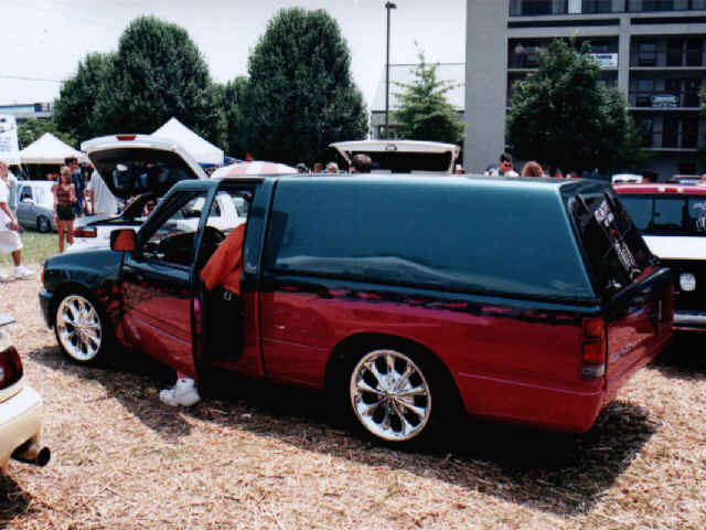 Rodeo chrome grille with Trenz fully polished billet insert, Rodeo headlights, Toyota 4wd chrome bumper, Toyota 4wd chrome valance with Trenz fully polished billet insert, clear turn signals and marker lights, Leer topper, Amigo rear end with swing out tailgate, steel roll pan, frenched tag box in tailgate, shaved antenna, shaved hood squirters,shaved third brake light, shaved door handles, shaved key locks,shaved tailgate handle, shaved roll pan, and shaved body seams, custom paint
