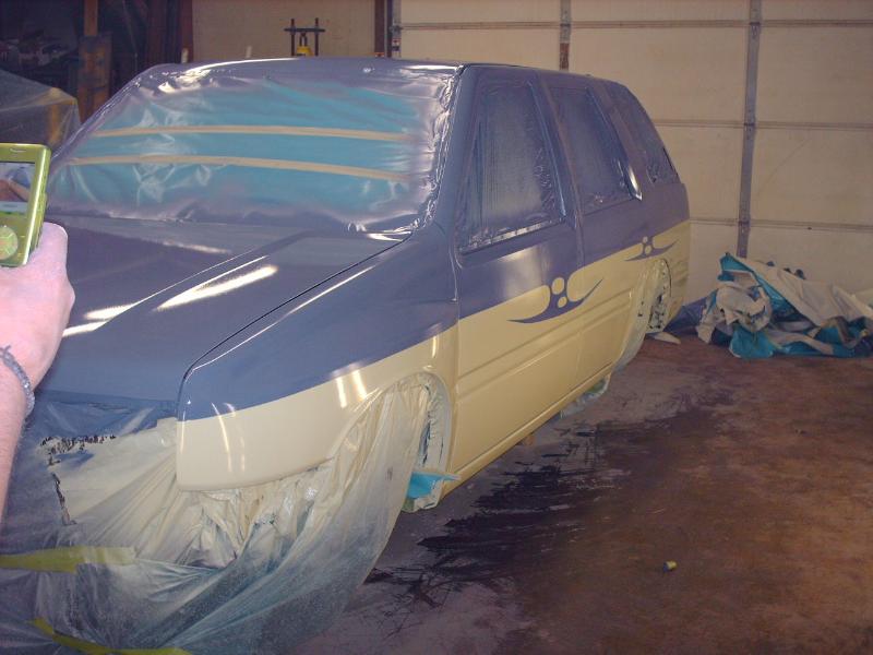 2.6 ltr 4 cyl w/ a 4spd AUTOMATIC TRANSMISSION. Modded Honda Civic intake and a yellow top. A lot of relocated crap. And big holes with giant wheels poking through!!!