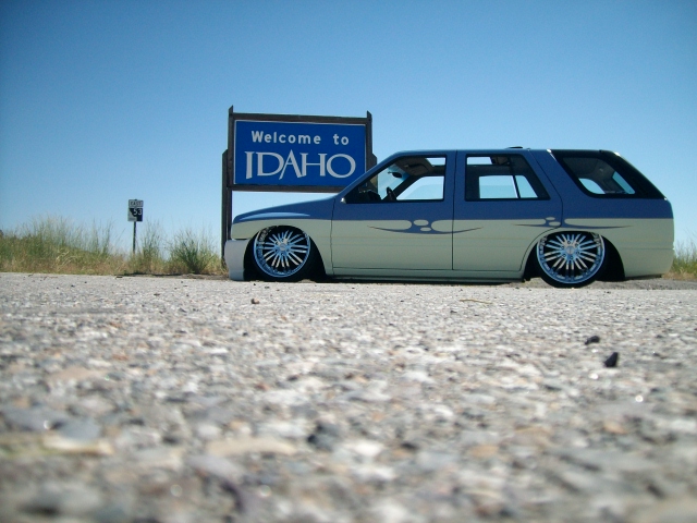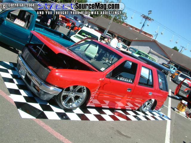 Bodydropped 2 1/4 inches traditional. Thanks to Jay with Fab-Lab and the crew at Advanced Auto Design in Auburn . Bagged front and rear with 2600lb Slam's(thats right, you read correctly, 2600's up front too). This thing gets some crazy mad lift. Its NUTZ! Thanx, Jay from "FAB-LAB". We swapped out a '91 Space cab front clip from the firewall fwd and z'd it up 2 inches while we were at it. The rear was notched and the floor was raised 5.5 inches to cover it all up again. I replaced the rear end with one out of an '87 spacecab which allowed me to get enuff room to get the tires all the way up without rubbing the outer skin. It was all bolted to a solid 2-link that was made by Mothergoose Customs up in Canadia and all welded in by me and Jay. The rear door jams and doors were cut out to give the rims room typical 4-door suv style. Trailer tubs were put in and I am waiting to finish the doors and jams until the bodydrop gets done. A set of 2" drop spindles from Aim finished laying the frame flat on the ground. The entire system is controlled by the Pressurerite system from FAB-LAB. I'll put some new pics up soon.