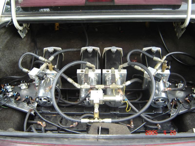 4 hi low eliminator pumps square dump on front pumps, italian dumps on rear, 8's and 4 tons in front, 14's and 2 tons on rear, reinforced rearend, arches, 1 inch extended and reinforced upper arms, chained front, chain bridged rear 10 batts, 4 switches