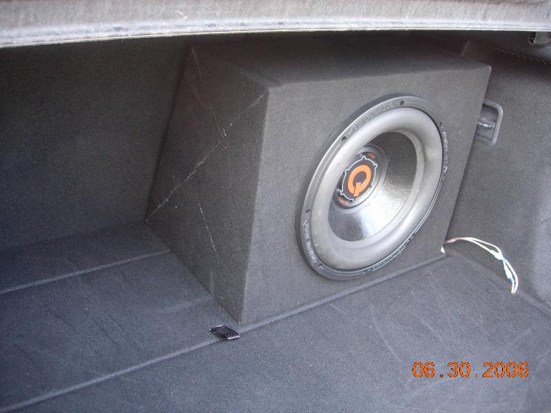 Quantum 800 rms 12" sub, powered by a 600w kiker amp. Custom made sealed box.