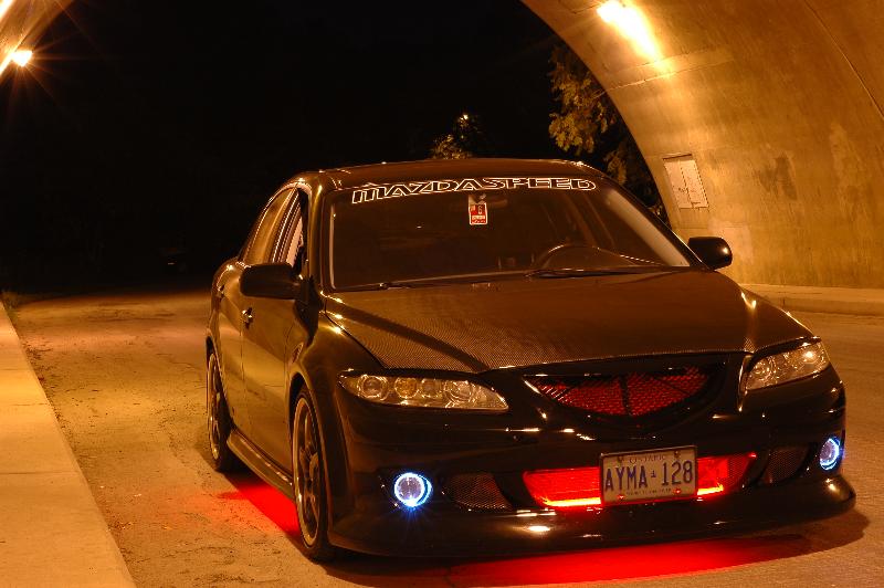 Seibon OEM carbon fiber hood, JDM Mazdaspeed tails, JDM eyelids, JDM Kenstyle front bumper, AutoExe carbon fiber B-pillers, Badgeless front grill, Streetglow gold series underglow, tint (35% - front, 20% - rear), 8000K HIDs, LED angel eye lower fogs, de-badged, door guards shaved, LED/clear lower rear reflectors