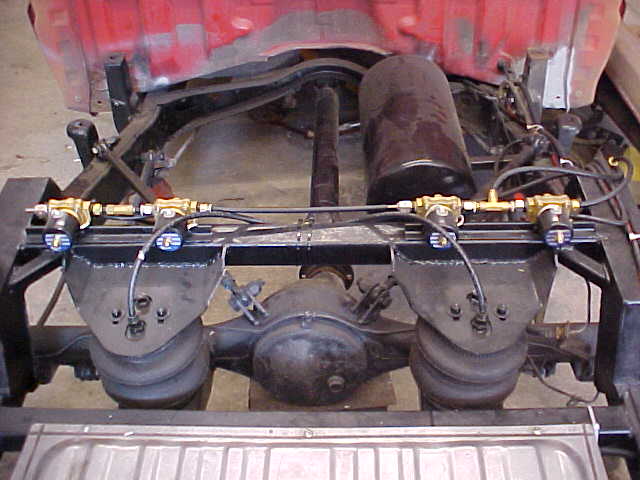 Bagged, 4 linked, Rear mount bagmounts. Engine driven compressor (factory A/C converted), No limit Customs Billet Hubs, redrilled 5 bolt axles