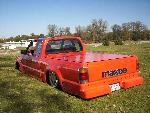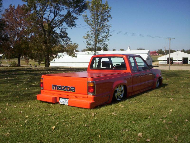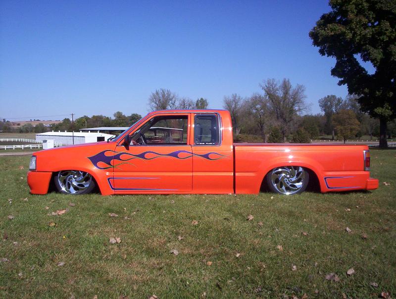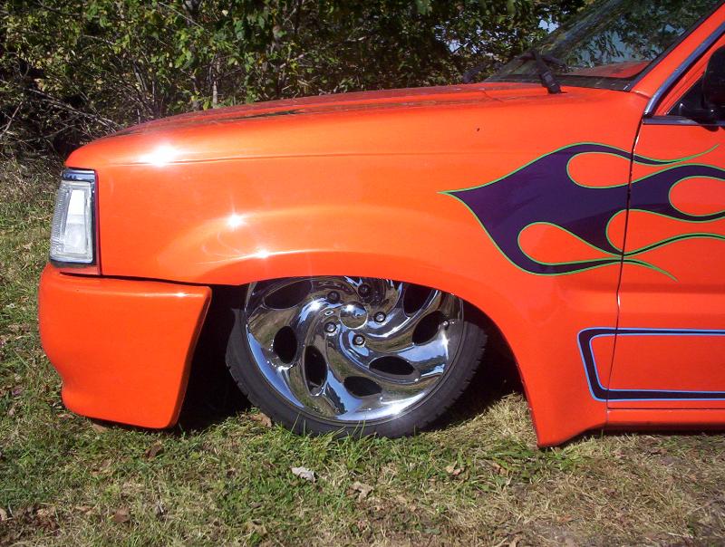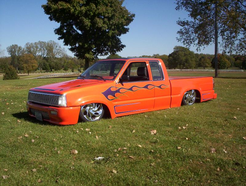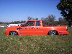 bdy drpd 2 1/2, shaved entenna,door handles,emblems,box seams.split and molded rear bumper to box.toyota chrome front bumper welded together and lengthend on sides .skirted front wheelwells on 4x4 sheet metal.custom mix candy orange and candy purple old school paint job.all work done by myself at MIDWEST CUSTOMS 319-551-0818
