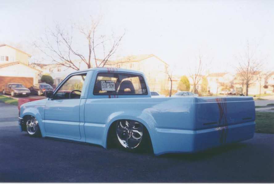 Shaved bed seams,tailgate,gas filler door,tail lights,door handles,locks inside and out,embelems,antenna, cowl pannel. Sliding rag (20x34),toyota 4- runner bumper and valance, LED tail lights, checkmate flush tonneau, custom paint,lexan rear window. oh and 4x4 sheetmetal.2-1/2" bodydrop