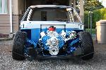 Body dropped 2 1/2 inches laying pinch, Sliding rag top, shaved everything, frenched atenna in rear quarter, 04 ranger headlights, toyota 4runner front bumper, blue and silver two tone paint, 4x4 hood.