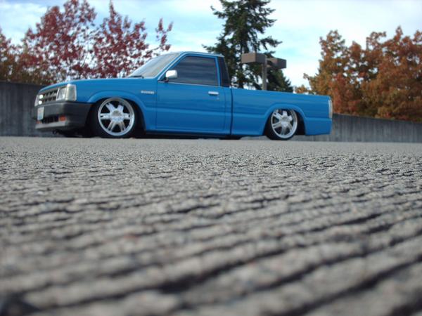 Completly replaced the bed floor and bodydropped it all the way up. Shaved the antenna hole, cab seems, gas filler door (relocated to center of filler panel under bed floor and access by dropping the tailgate). Added a roll pan and frenched in the plate box. B2600 hood and custom paint by JRS Kustoms. Mazerati blue on top with pure white on the bottom, broker up by 4 coats of candy magenta traditional flames with real fire inside. Pinstriped by Dave with Austin Pinstripeing. All graphics and stripes into the jams. Thanks Jeff. Sponge says your gay!