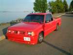 RED: CUSTOM PAINT JOB ON TAILGATE WITH MAZDA RED EXTERIOR, TONNEAU COVER AND CUSTOM FRONT END, CHROME ACCENTS, NEON LIGHTING, 8 STROBE LIGHTS IN THE TAILLIGHTS, AND MARKER LIGHT SOCKETS, AND A SET OF POLICE CHERRY'S UNDERNEATH FOR EFFECT.