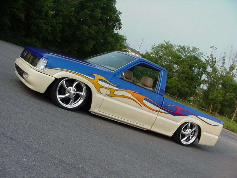Shaved body line, tailgate, tailights, door handles, cowl, gas door, bed has been smoothed out. HOK Truble & PPG cream using Sunrise, Sunset, & Magenta pearl conclude the paint scheme