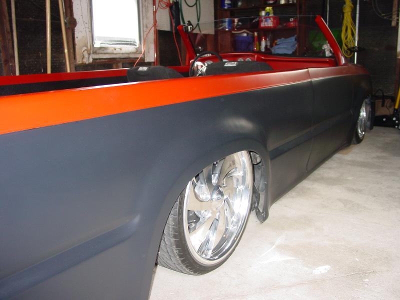 Shaved Handles, Shaved Mirrors, Suicided Drivers door, upper and lower Phantom Grille, Windshield Chopped, Chopped body, Uni-bodied, Flat Hot Rod black with Blood red on top.