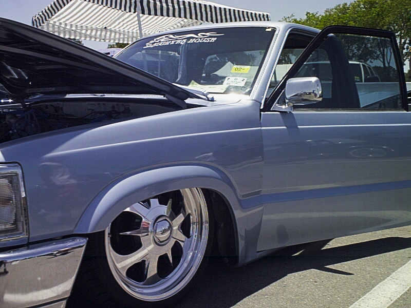 Color is Bayside Blue Metallic (PPG), shaved emblems, tailgate, rear lights, molding, gas door (relocated in bed), antenna, door handles and key holes. Smooth and tubbed bed. LED brake lights and 3rd brake light. Toyota 4wd chromed bumper and valance. Slim Top bed cover with electric pistons for remote opening and closing. Aeromach chrome hot rod mirrors, Maltese cross with snake arms. Dual German Helahorns (located behind bumper). Blow-through for stereo welded to back of the cab. Body dropped 2-3/4" (work performed by Slaughter House).