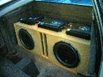 Clarion DRX725 pro audio head unit, 4 inch boston acoustics in front, JBL tweeters on a-pillars, infinity 6 1/2s in rear, 2 JL audio 12W6V2 subs in ported box, 2 MTX 6500D amps for the subs, MTX 6304 for the mids and highs, 180 amp GM cs130 alternator supplies more than enough power to 2 deepcycle batteries.