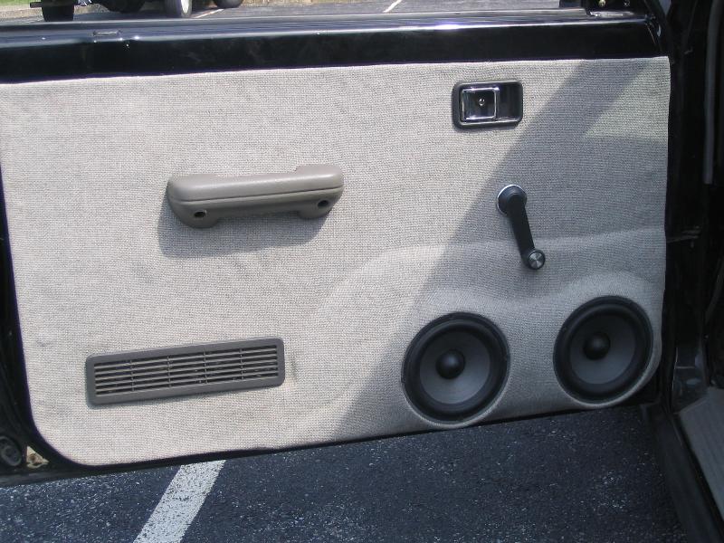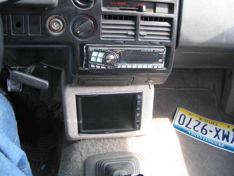custom door panels with 2 sets of focal 6.5" compnents fiberglassed in the door and wrapped in tweed, full wall with two kicker L7 12" subs, cadenec z4000 amp for the highs and z7000 for the subs, 5 farad capacitor, deka deep cycle marine battery for stereo with battery isolator and red top battery for truck, radio relocated into heater control panel, 6.8" ion tv molded into factory radio housing and wrapped in tweed, also hooke up to rear view camera in license plate