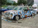 black primer with metallic green flames. soon to be solid black primer.shaved door handles,shaved mirrors,shaved wipers, skinned tailgate, shaved tailights, homebuilt phantom style grill, toyota bumper,shaved emblems, topless,shaved gas door.