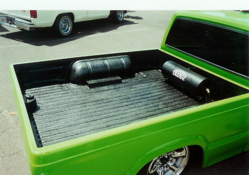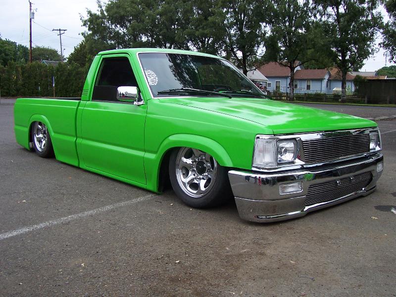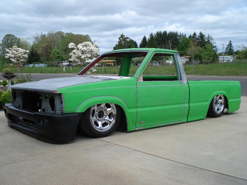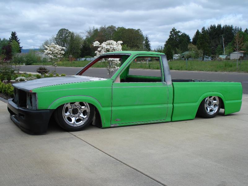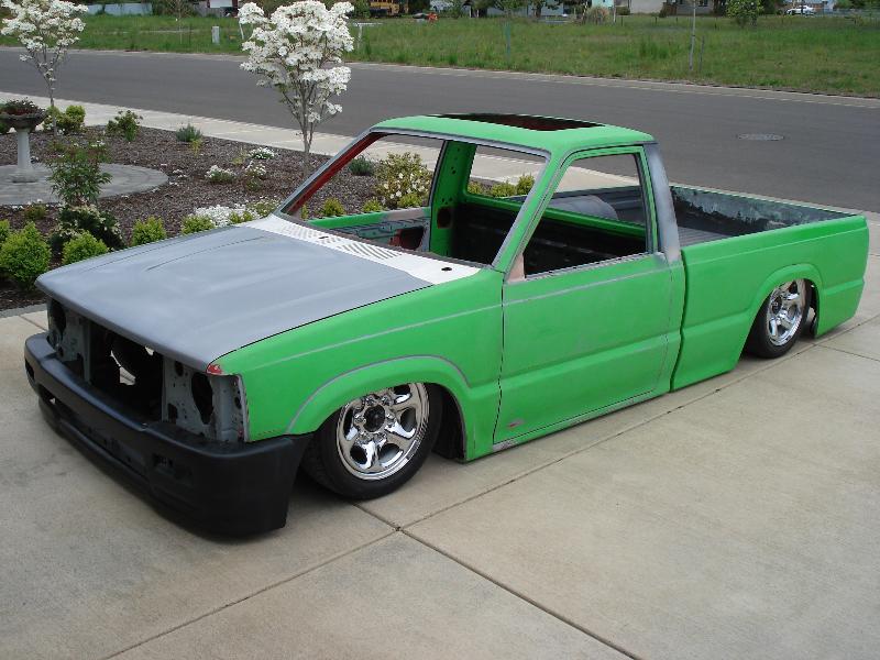 Body-dropped 3-inches / shaved handles, emblems, key locks, antenna, rain gutters, gas door, taillights, tailgate, b-pillars, wiper cowl, front corners, mirrors and body seams / door sills / FBI tailgate/roll pan skin combo with 10-inch flush mount LED taillights / Grant Kustoms weld on pillar shavers / Grant Kustoms one piece Toyota 4x4 bumper made to match the fenders / custom inner fender wells in engine compartment / fully shaved firewall - relocated brake booster behind dash / B2600I hood / relocated gas door in bed / took out all bedliner so the bed can be painted.