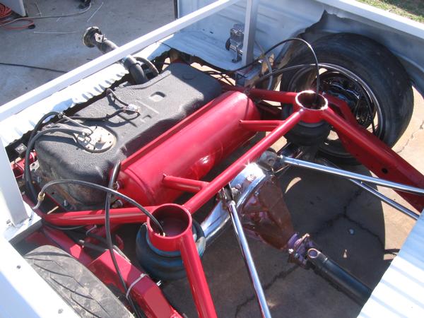 air ride all around frame had been painted red and the axle and 4 link is chromed relocated gas tank air ride components include viair 380 compressor 5 gallon tank and 8 3/8 ich valves the truck also has a 2 1/2 ich body drop