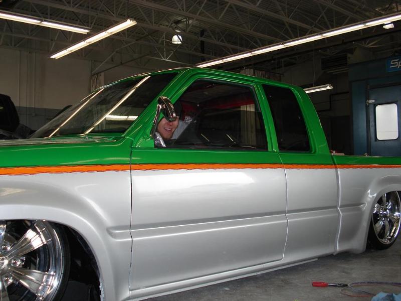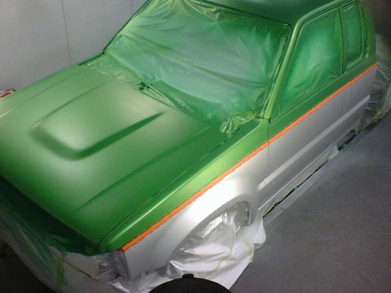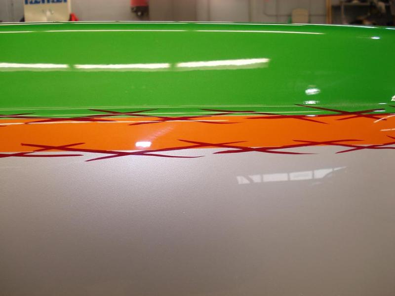 All House of Kolor- two tone pearl lime time green on top, pearl silver/white on bottom w/ sunset orange stripe and red slash pin striping on both sides...