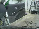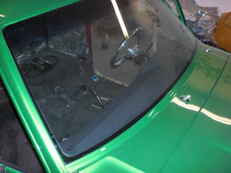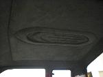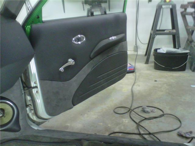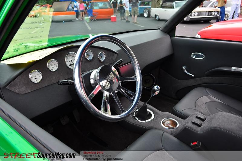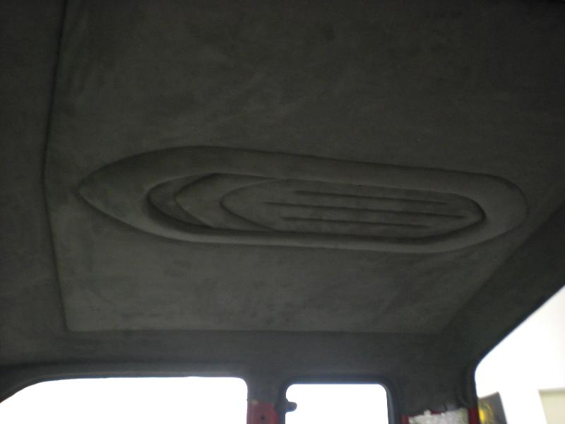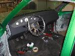 Hot rod style with charcoal vinyl and suede - 1 off sheet metal dash wrapped in vinyl and gauges are mounted in bezel wrapped in suede. JVC double din in dash. Custom - door panels, center console, kick panels (by Sosa), headliner, sub box w/ 4-10" Kenwood subs and 2 kenwood amps floating over subs