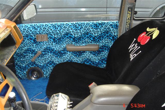 Smoothed dash, painted Black, custom bucket seats, lowered seat brackets, blue leopard door panels, blue shag rug, gtant GT steering wheel,