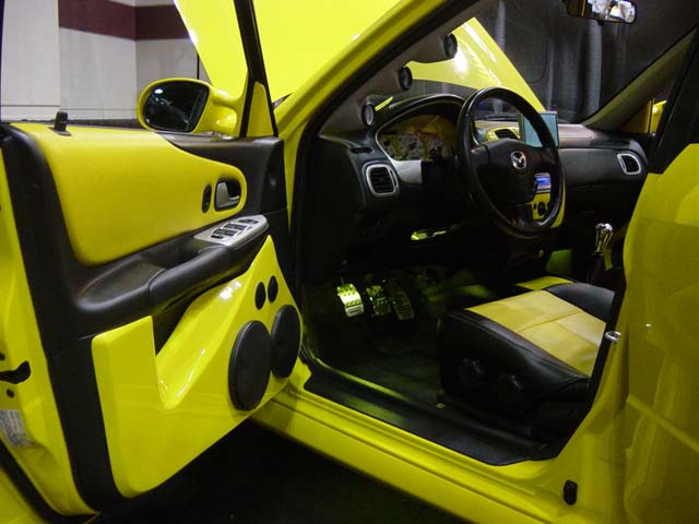 Katzkin leather interior, fiberglassed and painted parts, silver dash kit, yellow and white neon throughout.