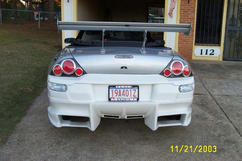 Euro tail lights, aerospeed gas cap, clear third brake light, chrystal clear turn signals in front, clear reverse lights, 2 1/4 catback with dual sebring mufflers, Nakayama 10 " double stack wing, carbon fiber hood with APC hood pins, black vinyl eyelids on headlihgts, Hyper industries blue HID bulbs,red L.E.D. lights custom installed in headlights,B0MEX body kit,SHAVED DOOR HANDLES