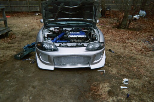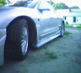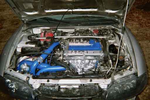 4G63 2.0 DOHC: Turbonetics T04 Turbo, Apexi S-AFC-II, Spearco FMIC, HKS BOV, custom 2 1/2" turbo piping, ported manifold, 3" exhaust from turbo to axle then 4" from axle to tip (NO CAT), MSD 8.5mm wires, denso plugs, custom air intake - K&N Filter -(relocated at front bumper passenger side) 660cc denso Greddy injectors, Turbo XS Boost controller, aeromotive fuel pressure regulator, walbro fuel pump - boosting at 21psi.
