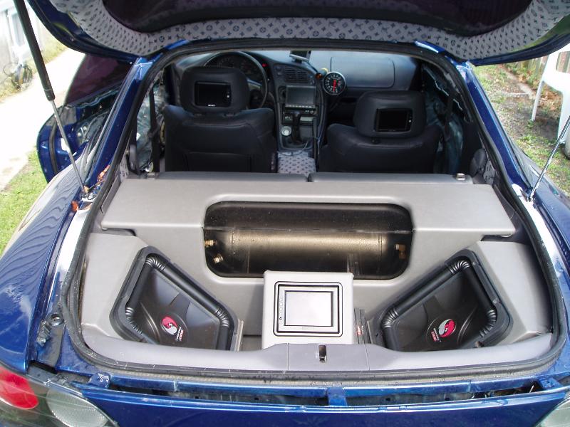 escalade blue, shaved rear s2000 taillights, body kit, mural on hood