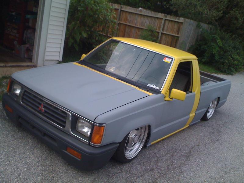 bodydropped,raised bed floor 6 inches, shaved handles , replaced grill and fenders back to mitsu, shaved gas door and relocated to bed floor , shaved inside bed walls , rear skin combo , eclipse hood bubble grafted in hood , squirters gone , rear cab light gone