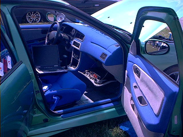Full Custom Blue and Grey Tweed Interior, Rear deck cut out to increase SPL transfer to cabin of car, Carpeted shelf cut out also, custom made rim wrapped in tweed to hide cut away metal, SunPro Aftermarket BIG Tach, 2 Blue Tenzo R Racing Bucket seats, Custom Built Seat Brackets From www.mmrusa.com, Brand new grey carpet and Blue Original NISMO floor mats w/aluminum badging, Brand new grey leather factory steering wheel, All new grey plastic trim, and door Gaskets.