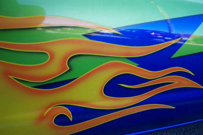 Shaved taillights, rollpan, smooth tailgate skin with LEDs, 03 xterra headlights, billet grille and bumper inserts, painted lime green and electric blue with yellow and orange tribal flames