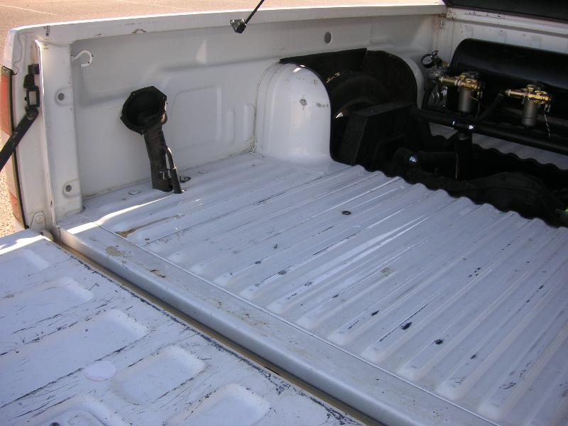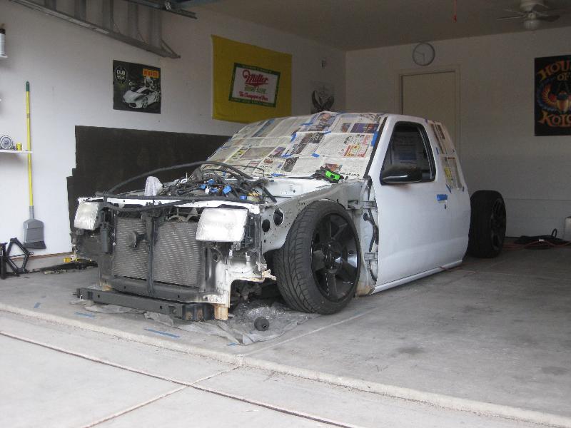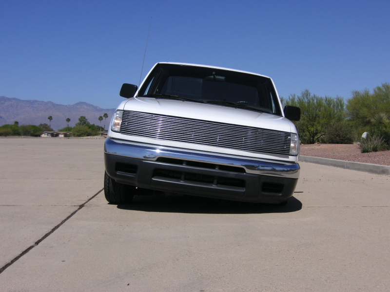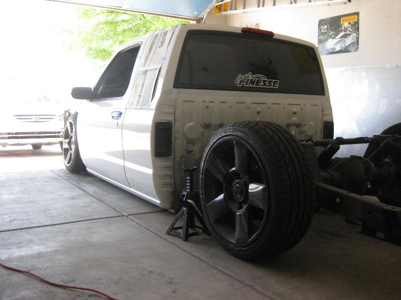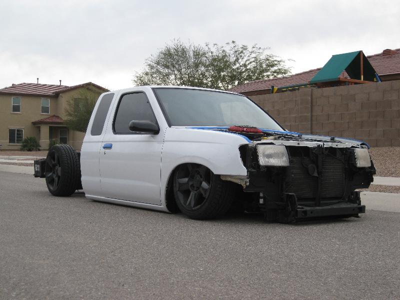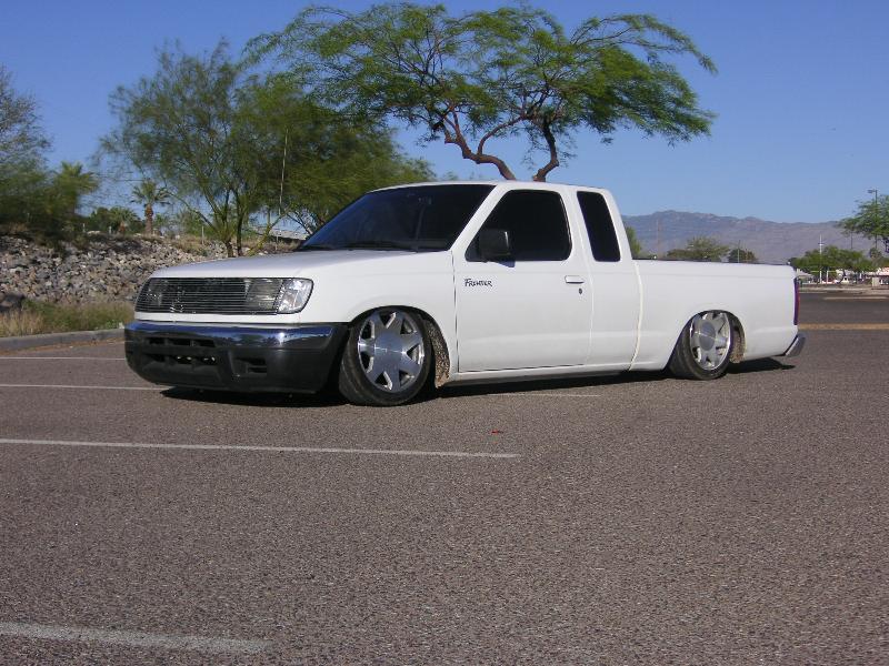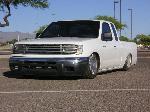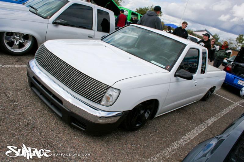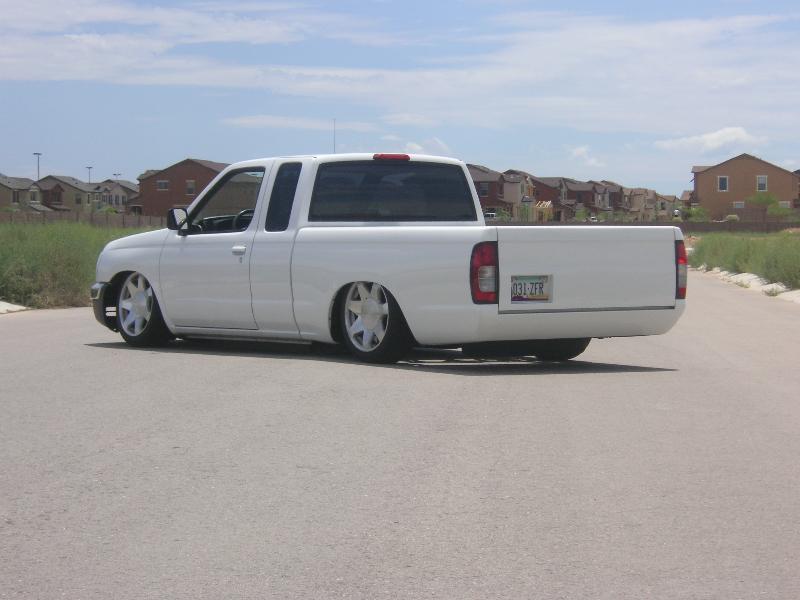 4" Body drop (2.5" stock floor, 1.5" traditional), tubbed for a 27" tire, Clear corners, 6k HIDs, 98-99 Frontier tails(clear reverse light), phantom grill, tint, solid rear window, checkermate tonneau cover, relocated handle, platebox in tailgate, smooth roll pan, shaved cowl, street scene mirrors