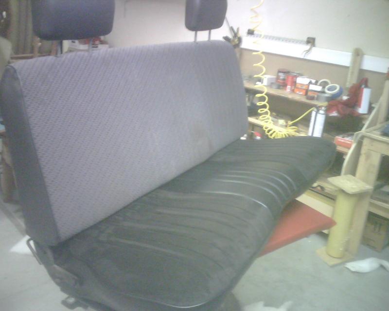 tweed pillars, headliner done in black tweed with 3d flames, factory bench redone in black suede and black vinyl. center of dash painted white to match exterior. all work done by owner