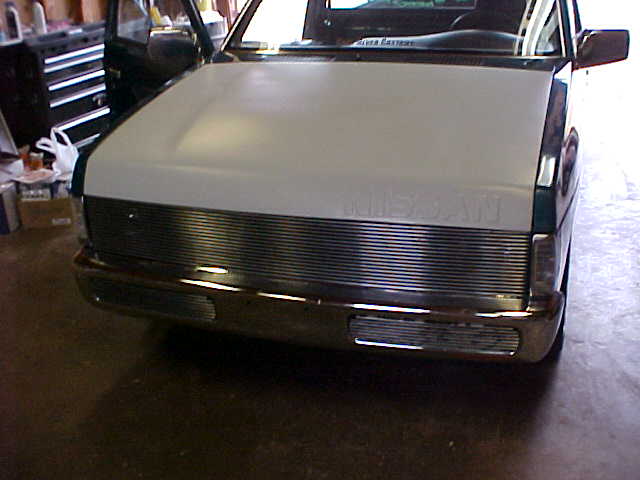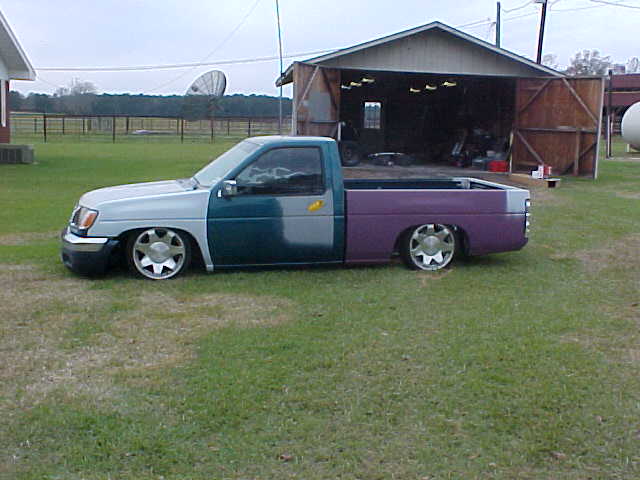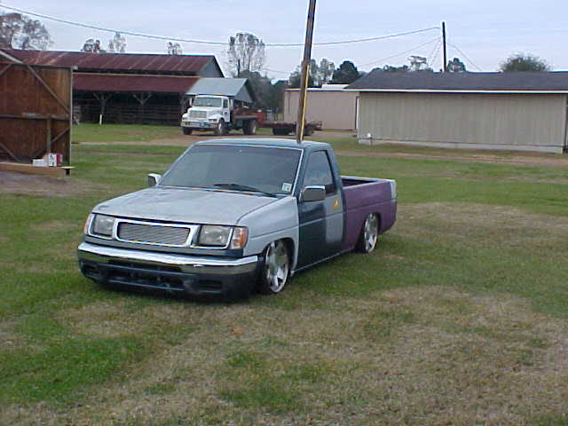 2000 Frontier front clip, honda civic door handles, shaved fuel door, shaved hood squirters, shaved antenna, cali combo in rear. custom rear frame clip with built in tank and compressor rack, smooth and painted frame, frame is House of Kolors Passion pearl, spindles,control arms, four link, driveshaft and rear end are painted House of Kolors Limetime pearl.