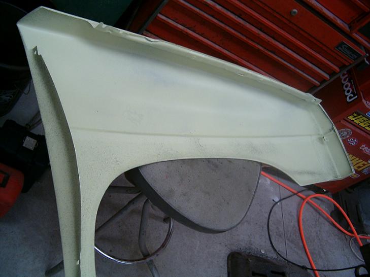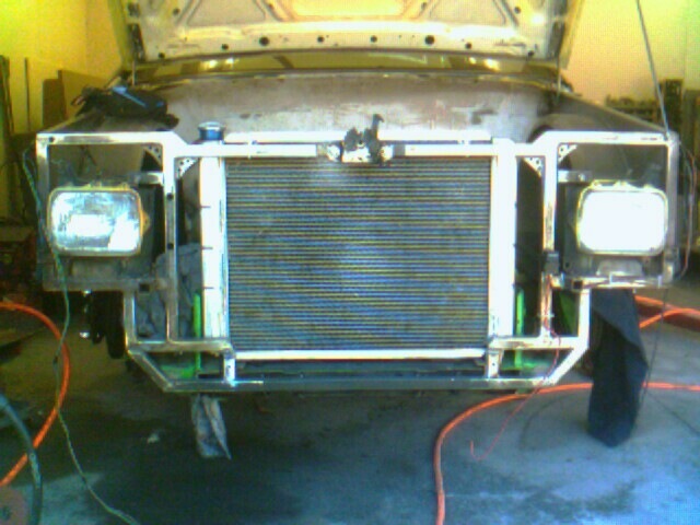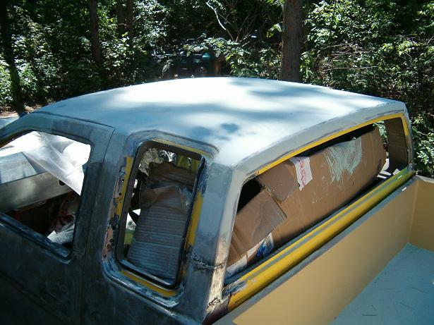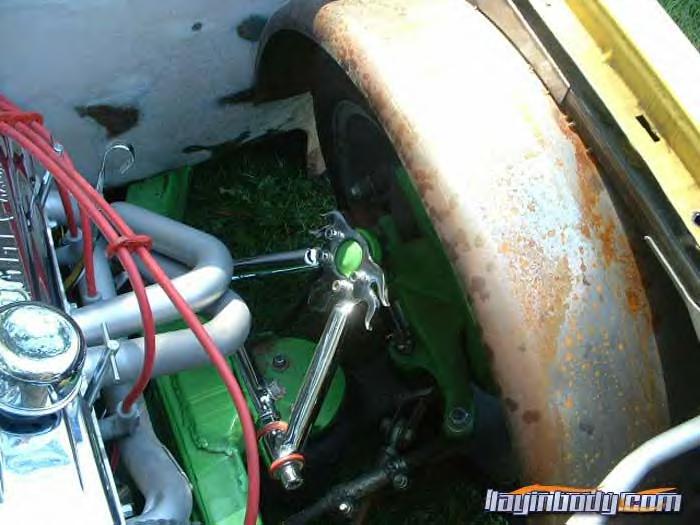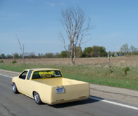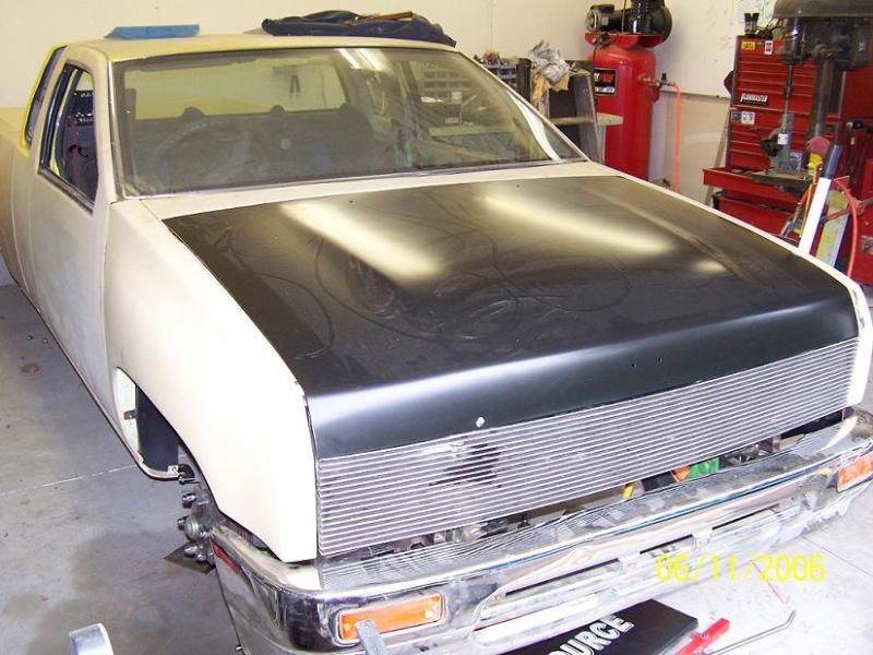Cab height is 45.5 inches. Rolled fender lips. 2 3/4 inch bodydrop, 5 inch choptop. Shaved handles, mirrors, Nissan emblems, antenna, bodyline, windshield squirters, completely shaved rear-end, cowl, gas filler door, corner markers, re-skinned roof, and smooth firewall. Currently primer on the outside, motor compartment is painted "Dimont" organic yellow over white sealer. Other accessories include a chrome toyota bumper and valence and suicide doors with Bear Claw latches. The inside of the bed is hand fabbed out of 1"x1" square tubing, sheetmetal, and wheel tubs. Two 12 inch L.E.D's are located in the tailgate skin. The brake booster and master cylinder were relocated under the bed and the all the brake lines are stainless steel. I cross drilled the rotors at work on the CNC machine. New tubs were built into the front to replace the old inner fenders. Custom tubular core support. Mud, primer, and paint by JB.
