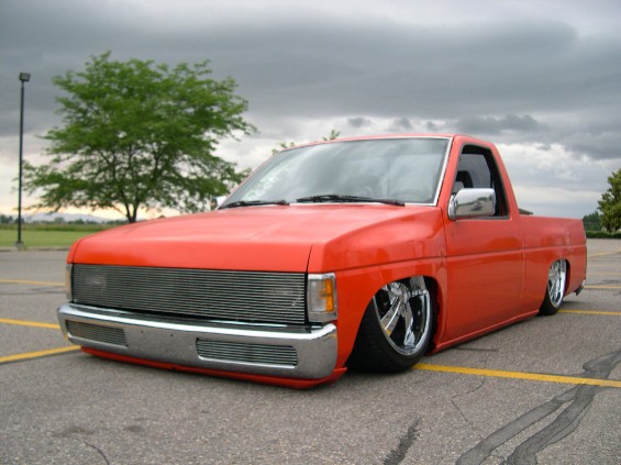 shaved hood emblem, hood squirters, door handles, 3rd brake light, tailgate handle; orange primer- i swear it's primer stock floor bodydrop, bout 3 inches, enough to lay rocker.
